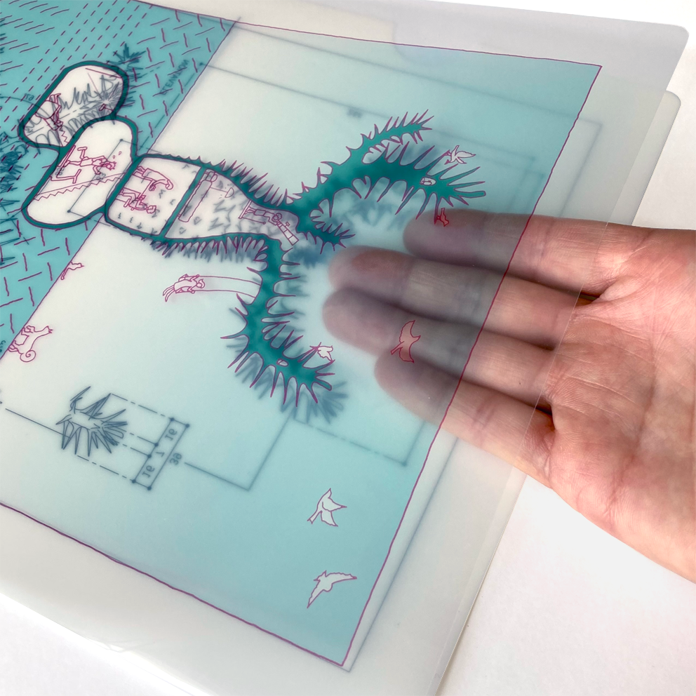 ・クリアファイルの表面は植物の一瞬を閉じ込めた詳細図面、裏面は"植物に暮らす"をテーマとした空想の世界を手書きで描きました。